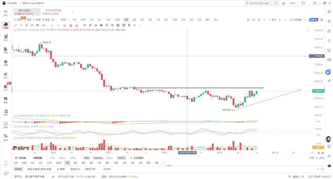 - 价格区间:当前价格在 67,882.07 USDT,近期低点为 65,618.49 USDT,上方关键压力位在 68,500 USDT 附近(前期平台高点)。