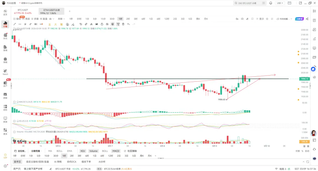 - 价格区间:当前价格为 1994.12 USDT,近期低点为 1906.63 USDT,上方关键压力位在 2020 USDT 附近(前期平台高点)。