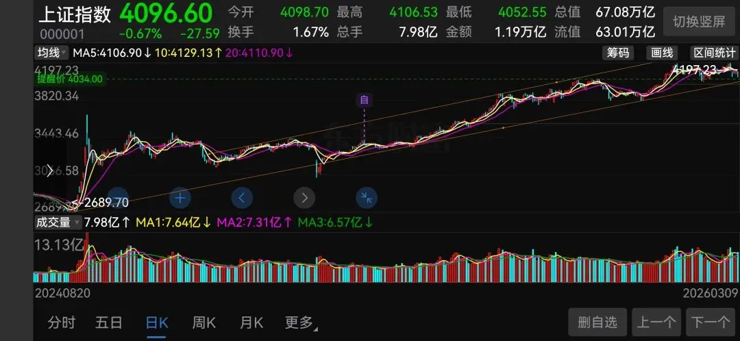 然后看强支撑位,20周线,图中的紫色线,也已经被跌破了,当前20周线对应546.84元,而今日收盘价是525.99元,也在表明之前强势上涨的那个阶段结束了目前不是建仓的好时机,反而是需要谨慎和兑现的时候了大盘目前还好,4034的支撑还在,也没有跌破上涨的趋势线下轨,暂时不用担心大盘