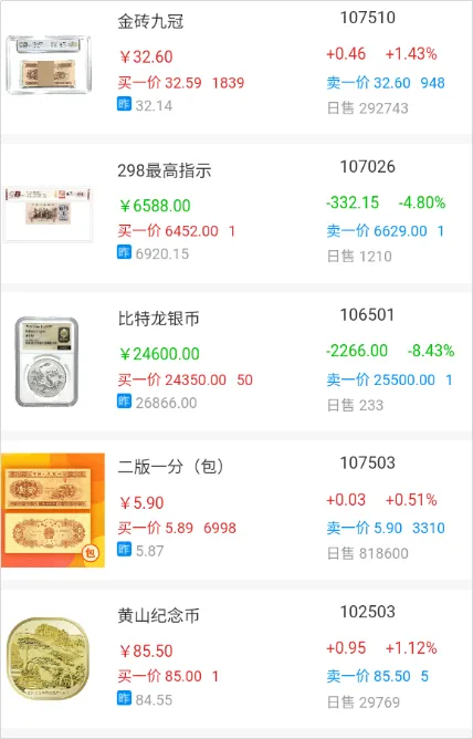 今日销售额前五:金砖九冠107510,298最高指示 107026,比特龙银币106501,二版一分(包)107503,黄山纪念币102503