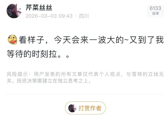 本周3暴跌前的(雪球明文)提醒舒服吧,我的铁粉们估计你们N多人都减仓了。我(雪球明文)提醒+(大V圈子)提醒+(自己小圈子)提醒,基本上把风控做到位咯。看看9:43大盘分时图暴跌迹象明显吗?根本看不出来有暴跌迹象,这个就是提前预判3月份的风险,做出的提前预判,所以,今年你们担心顶部我判断不出来吗,这种单日暴跌我都能预判出来,顶部跟我混带你们躲没毛病。我下面的视频号,需要关注1000人才能开通功能,麻烦各位粉丝给我(关注)起来,说不定以后我能(视频号)给你们分析A股观点!!现在(美伊局势)的发展会演变成(一场持久战),所以,对整个3月份全球股市造成的影响就是:深跌-反弹-继续深跌-继续反弹,所以,整个3月份没出现大规模的全球股市大级别普涨,就把仓位控制好。这个月只要你的本金回撤低于5%,都算是很牛逼的操作,我上周总资金回撤0.76%,看本周结尾是红的还是绿的,本月只要我的回撤低于3%我就非常满意,有大的反弹我就加大仓位做一做,没有就继续持有中线股-微套-苟着就行了。所以,雪球发文会带你们全程度过最难做的3月份,我现在的思路就是空出来大把资金,等指数单日低开大杀跌恐慌的时候适当捞点做隔日反弹,如果不反弹就继续等后面的大跌机会。现在3月份最大的不确定性就是(大爷开会完)A股的走势怎么走的问题,如果走得不好就会破掉4000点,就看(大爷)进不进场干活的问题了。这个月别预期太高很难做。今年我是这么判断的,1年一共有12个月,3月-11月-12月份是(阴跌月份),然后震荡月份估计会有(5个月),主上涨月份有(4个月)抛开今年1月份的主涨,后面还有3个主涨月份,就看是那3个月好做上仓位上融资干!只要把这3个月做好,今年大家的收益会很高。其他月份我会把我的(风控预判)发挥到极致来判断。大概就写这么多吧,(主要是等你们回帖留言),好奇你们会问些什么问题。这个月多看我的(雪球发文吧),大家加油!!欢迎各位粉丝(多转发-点赞-收藏),让更多人看到关注我!!