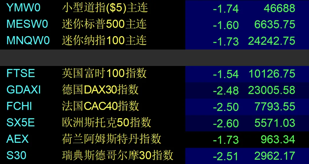 从目前开盘的美股期指以及欧洲市场的重要指数来看,美股期指跌幅均超过 1%,欧洲几大指数跌幅也在 1%以上,因此从当前情况来看,明日行情并不算乐观。