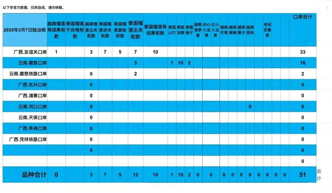 陆运口岸数据越南榴莲总出关数据:17/20柜。泰国榴莲总出关数据:12/9柜。