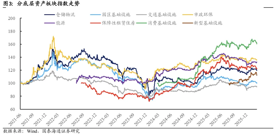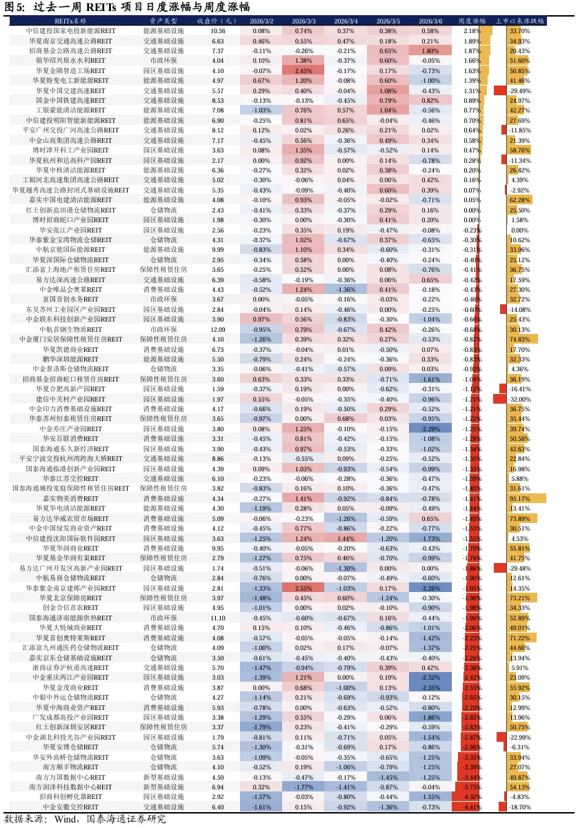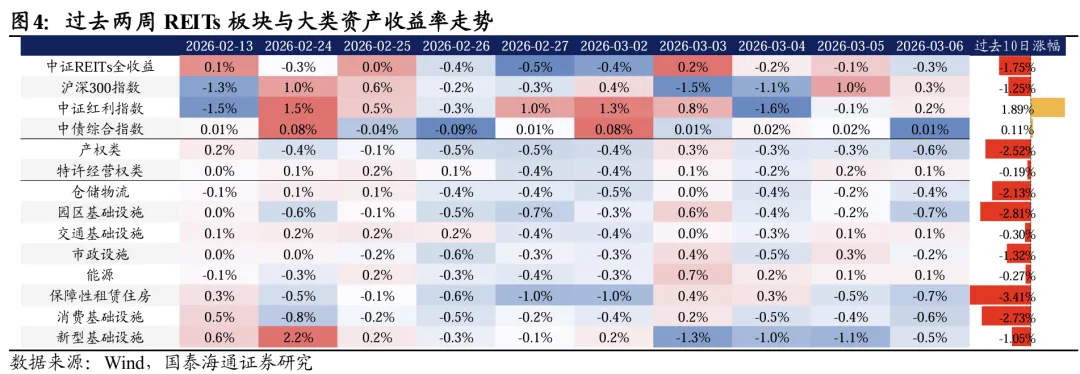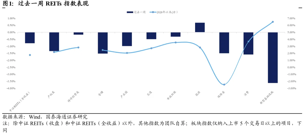过去一周新型基础设施与消费板块整体跌幅较深,涨幅收正的项目集中在高速、能源以及市政环保板块。过去一周REITs市场前期强势品种持续止盈,其中消费板块已连续两周调整,新型基础设施板块全周下跌3.62%,润泽科技REIT回吐自宣布扩募以来的全部涨幅。而部分高速、能源以及市政环保板块项目后来居上,过去一周录得正收益的同时,2026年年初以来的累计涨幅也已位居市场前列。