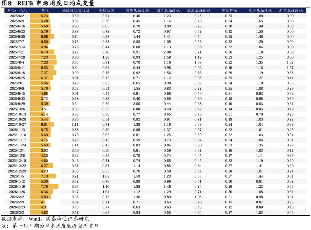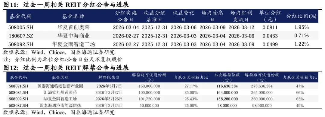 过去一周(2026年2月27日-2026年3月6日,下同)REITs指数整体下行,其中新型基础设施和消费板块REITs跌幅较深。过去一周中证REITs全收益指数周度跌幅在0.79%收于1027.62。从底层资产来看,过去一周各板块多数下行,其中新型基础设施和消费板块REITs跌幅较深。具体来看,涨跌幅由高到低分别为:能源(0.68%)、市政环保(-0.31%)、交通(-0.49%)、产业园(-0.98%)、保障房(-1.50%)、仓储(-1.53%)、消费(-1.59%)、新型基础设施(-3.62%)。截至2026年3月6日,国内REITs市场共上市79只,总市值2250亿元,流通市值1245亿元。