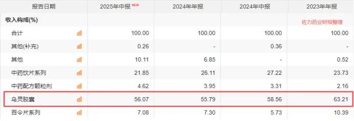 从营收结构看,近几年乌灵胶囊产品营收占比维持在60%附近,成为了佐力药业的核心营收支柱。