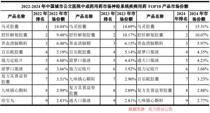 数据显示,2022年到2024年,在公立医疗机构终端神经系统疾病中成药市场中,乌灵胶囊增长势头强劲,连续稳居市占率第一,并且市场份额还从14.04%提升到了15.31%,继续抢占市场。