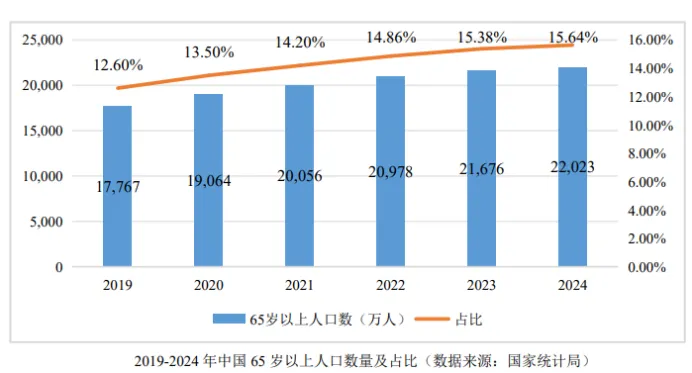 公司的这一产品,对应的正是日趋老龄化,以及失眠的年轻化。数据显示,2024年我国65岁及以上人口已超2.2亿人,同比增长1.6%,占总人口比重也攀升到了15.64%,伴随的就是慢性病发病率呈现上升态势。