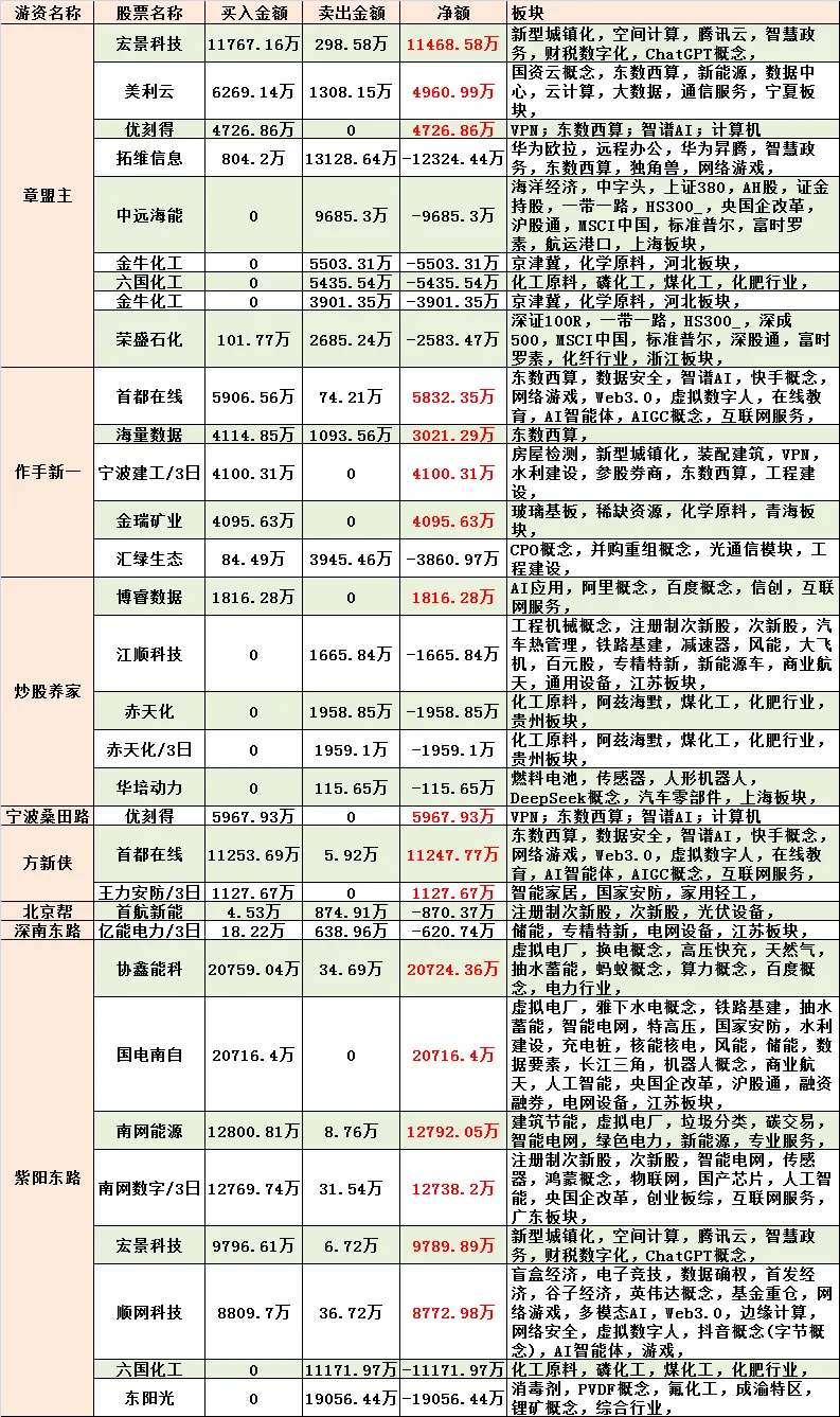 - 首都在线(14.25% 大涨):作手新一买入 5906.56 万、净额 5832.35 万;方新侠买入 11253.69 万、净额 11247.77 万,两大游资合计净买入超 1.7 亿元,同步布局东数西算、AI 智能体核心标的。