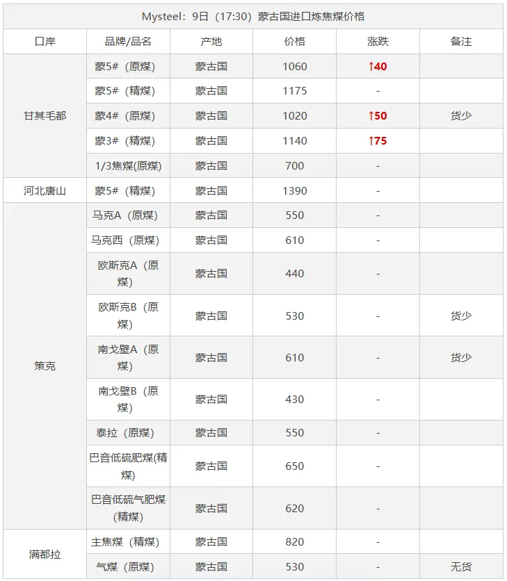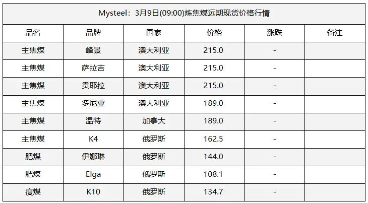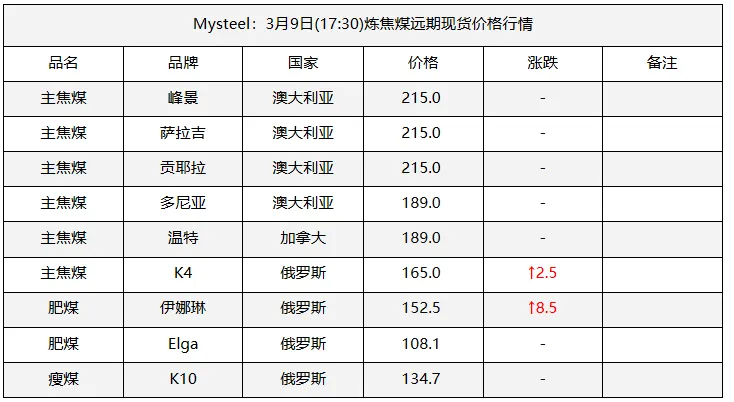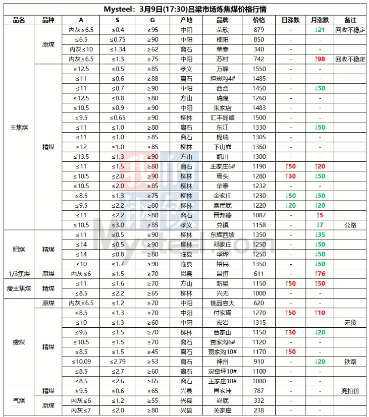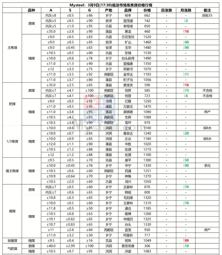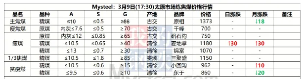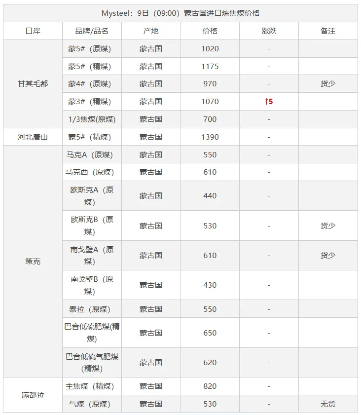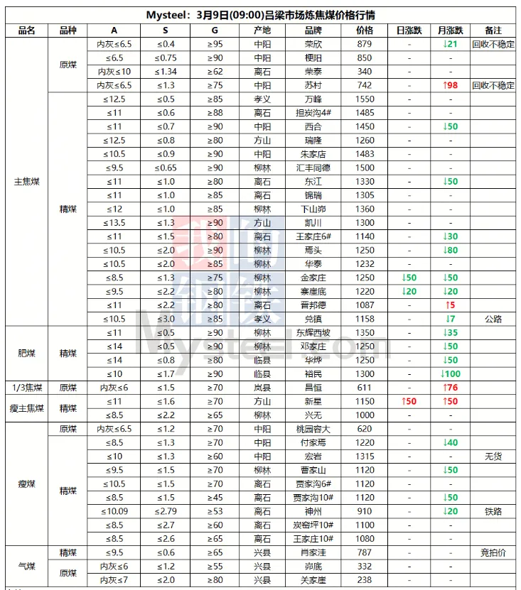9日太原市场炼焦煤价格暂稳。上周炼焦煤市场价格继续走弱,各煤种价格持续下跌。产量方面,重大会议期间煤矿生产依旧在持续恢复,后续产量将继续增产。而下游钢厂近期将维持高炉减产状态,对煤焦采购需求不佳,库存维持去化。短期来看,炼焦煤需求难有较好提振,宏观方面也未见重大利好,后续煤价仍将维持弱势行情。