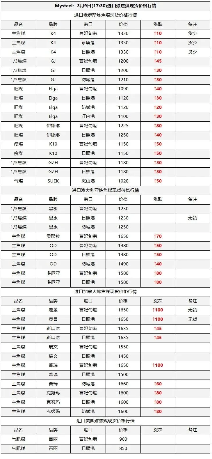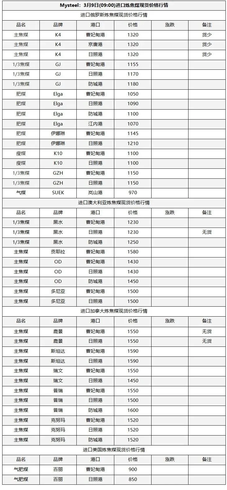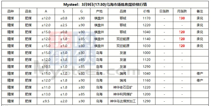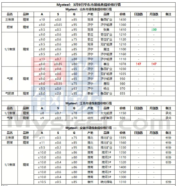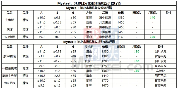 9日太原市场炼焦煤价格暂稳。上周炼焦煤市场价格继续走弱,各煤种价格持续下跌。产量方面,重大会议期间煤矿生产依旧在持续恢复,后续产量将继续增产。而下游钢厂近期将维持高炉减产状态,对煤焦采购需求不佳,库存维持去化。短期来看,炼焦煤需求难有较好提振,宏观方面也未见重大利好,后续煤价仍将维持弱势行情。