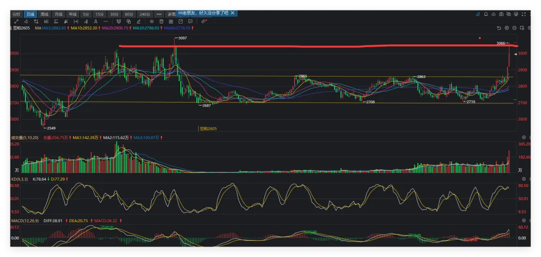 豆粕主力合约今日走出高位巨震、放量收涨的 “过山车” 行情,收盘报2995 元 / 吨,较上一交易日上涨 102 元 / 吨,涨幅3.53%。