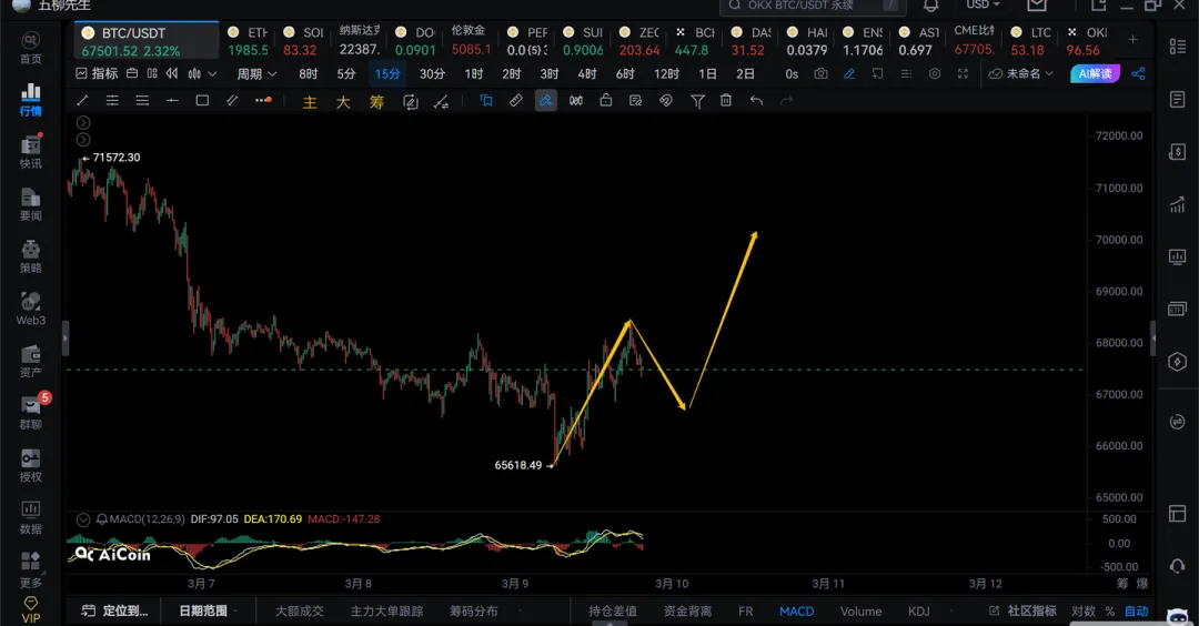 2)第二笔15分钟级别回调只要不跌破66000,那么就还会有第三笔15分钟级别的反弹