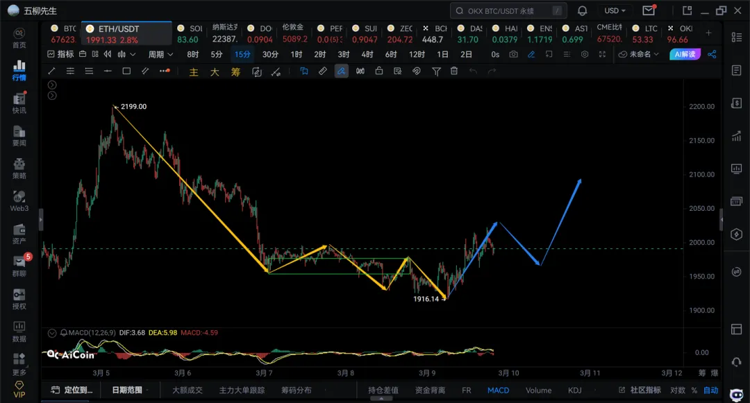 1) 以太前面1h级别的下跌内部是明显背驰的,大概率从2199开始的1h级别的下跌结束