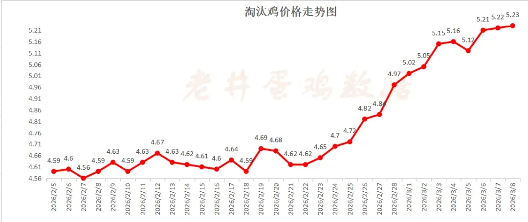 昨日,淘汰鸡均价5.23元/斤,较前日增0.01元/斤,增幅0.19%! 春节后蛋价由跌转涨,有一个逐步转化的过程。