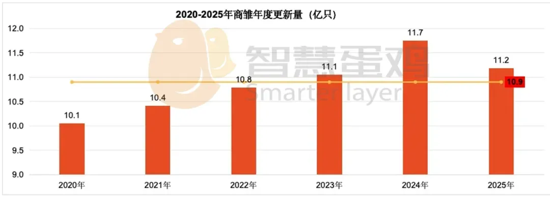 商雏补栏数量是决定未来在产蛋鸡存栏量的核心前置指标,直接影响后续鲜蛋供给格局。2025年度,全国蛋鸡商雏更新量为11.2亿只,虽较2024年减少5000万只,降幅4.27%,但仍位居近六年第二高位;较2020-2025年六年均值增加3000万只,增幅2.75%。值得注意的是,2021-2024年商雏更新量连续4年上涨,2025年的小幅回落,反映出持续亏损状态下养殖户补栏意愿已开始减弱,但补栏规模仍处于历史较高水平。