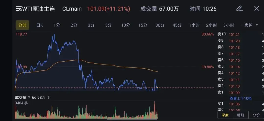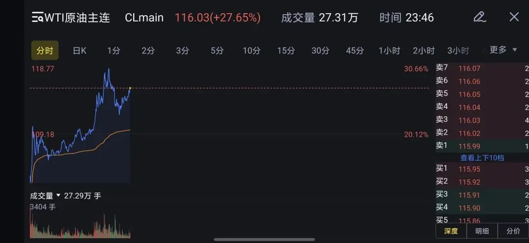 从伊朗宣布关闭霍尔木兹海峡,仅一周多的时间,国际油价走出了疯狂的上涨曲线:WTI原油3.9日上午冲击118美元/桶附近,一周时间翻倍。