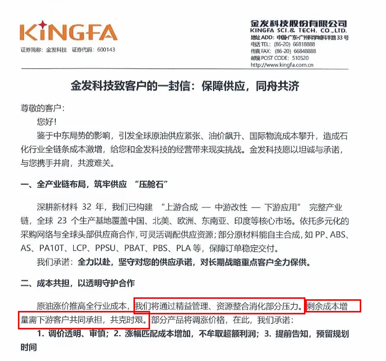 谁能扛的住,石化厂也扛不住!连金发微信公众号都发文要与客户同舟共济了,