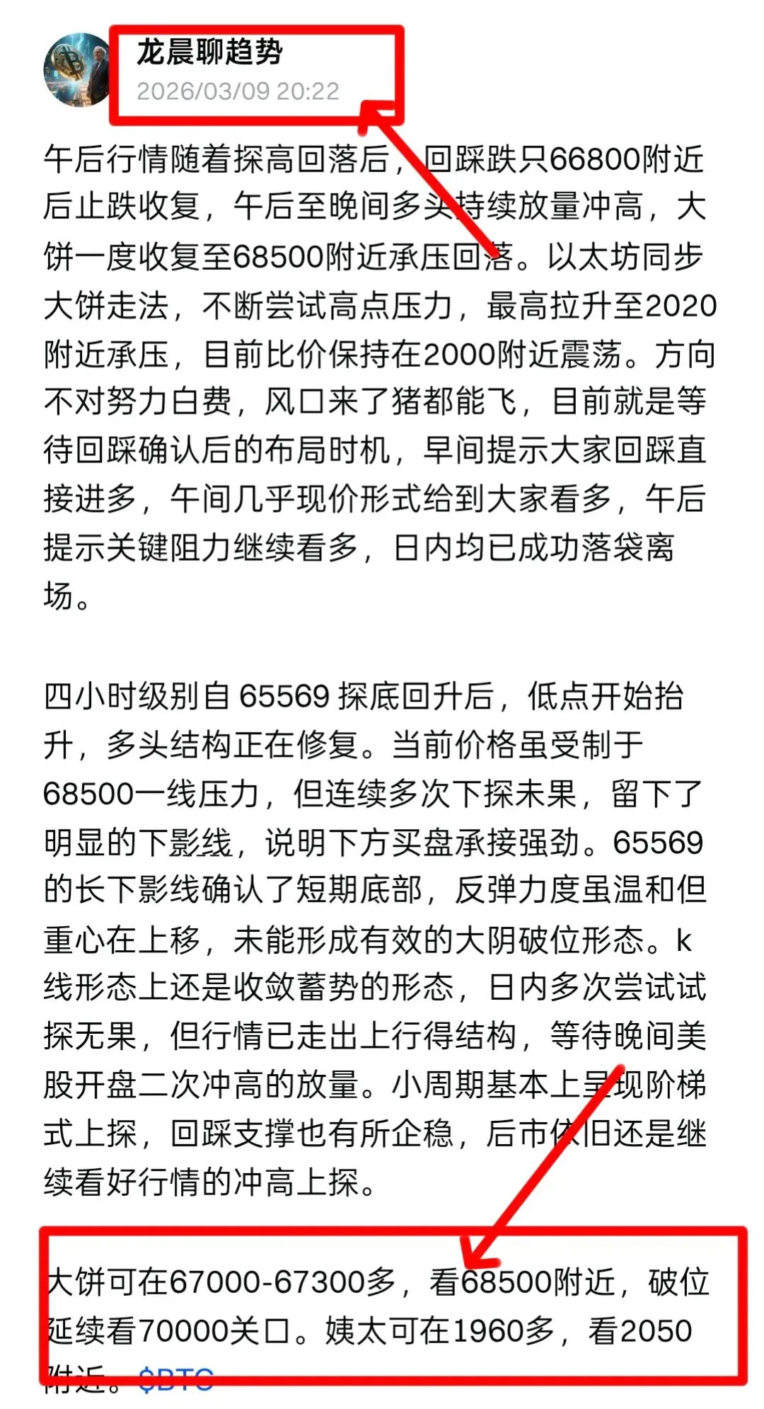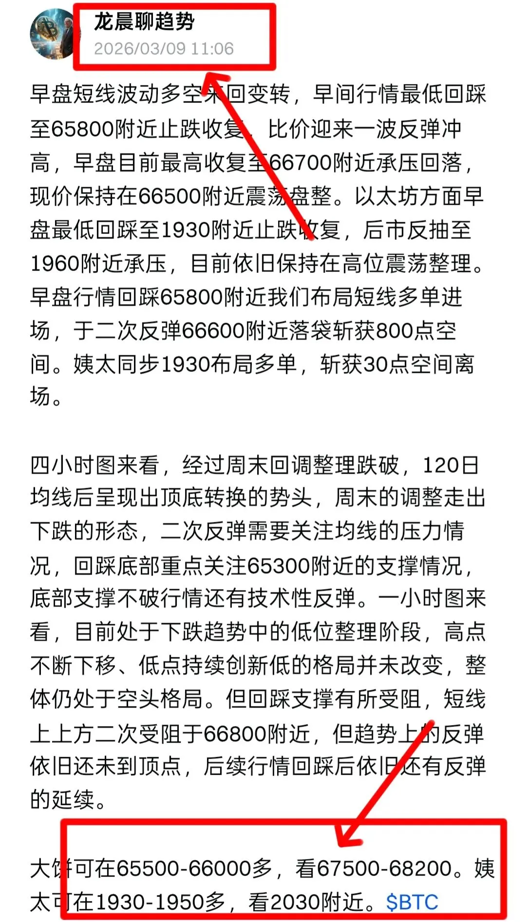 方向不对,努力白费,这句话说的就是不喜欢顺势的人,多也好空也罢,计划和规划没有到位很难得到一个比较好的结局,涨了就去空,跌了就去多,按主观思路去跟进,就很容易怀疑人生,我们需要做的就是跟随,回顾日内行情,白盘时段大饼在 67000 一线反复震荡筑底,多头蓄势待发,我们早间及午后多次提示任意点位直接多,精准捕捉起涨点,随后晚盘行情如期爆发,价格暴力拉升直冲 69449 高点,这就是趋势的力量,对于布局而言近期我们一直强调回撤做多,现在市场已经给出了明确的信号,多头再次占据主导地位,盘中提示全部成功拿下,大饼日内布局三单低多进场,斩获3200点空间,姨太同步大饼布局斩获115点空间。