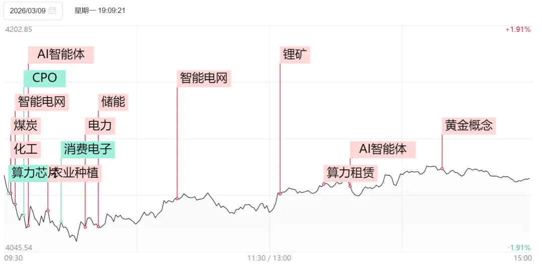 两会期间就是震荡,下跌是机会。今天在受外围带着大跌情况下,GJD还是出手暂时稳住了盘面。这种状态只看到周四,后面就要看伊美战争走向了。算力、电力方向今天较为强势,除了云服务期企业出来拉人群部署龙虾,地方政府也有对企业用AI的补贴。但该题材已经反复炒过很多次,这波只当做短线看待。