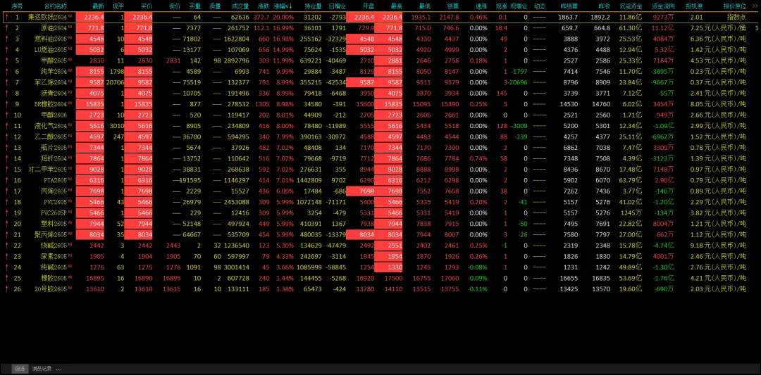 昨天,国内商品期货市场迎来能化板块史诗级涨停潮,化工全产业链呈现无差别普涨,成为市场绝对主线。截至收盘,能化板块20余个主力合约涨停/逼近涨停,资金大幅流入,成交量与波动率同步爆表,是近年罕见的全链条共振上涨行情。很多小伙伴都亚麻呆住了,后台私信已爆。大部分小伙伴都在咨询:“现在上车还来得及吗?”“这波行情这么猛烈,但持久吗?”“我要不要止盈??”别着急,我们细细道来。