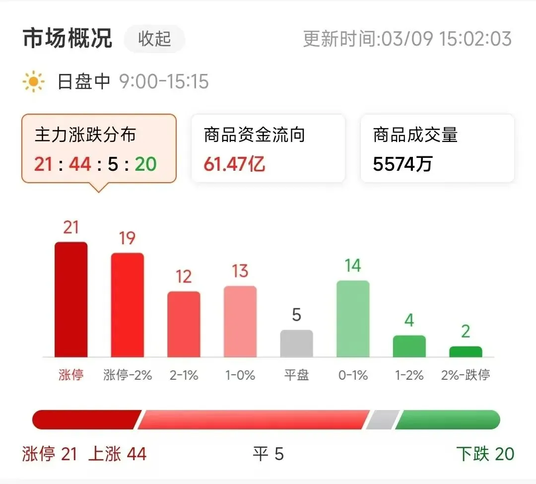 截至2026年3月9日15:00收盘,全市场涨停21个品种,超44个品种上涨,能化板块贡献了绝大多数涨停标的。