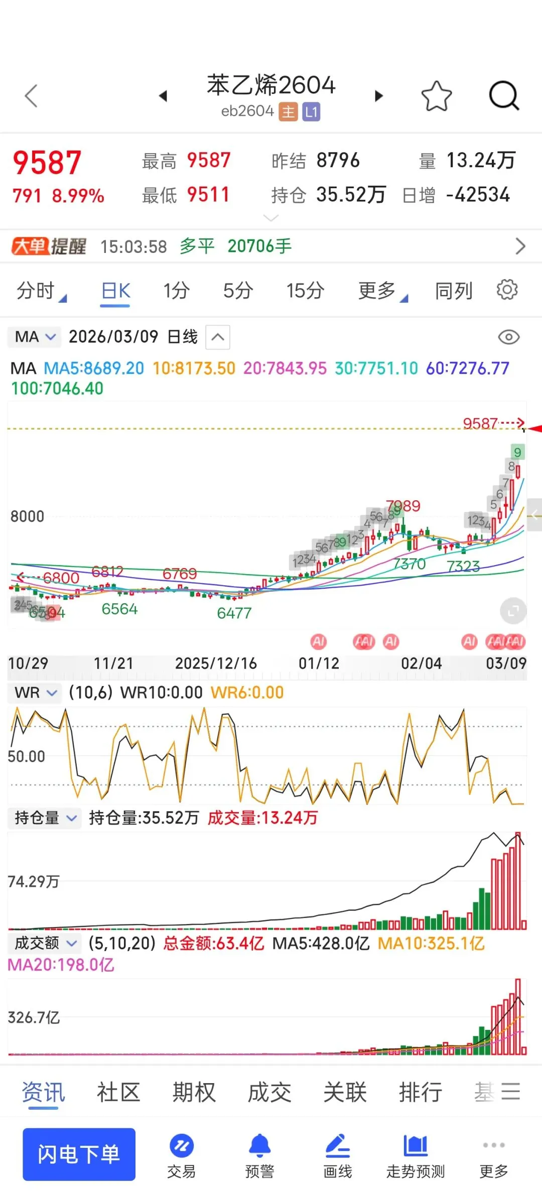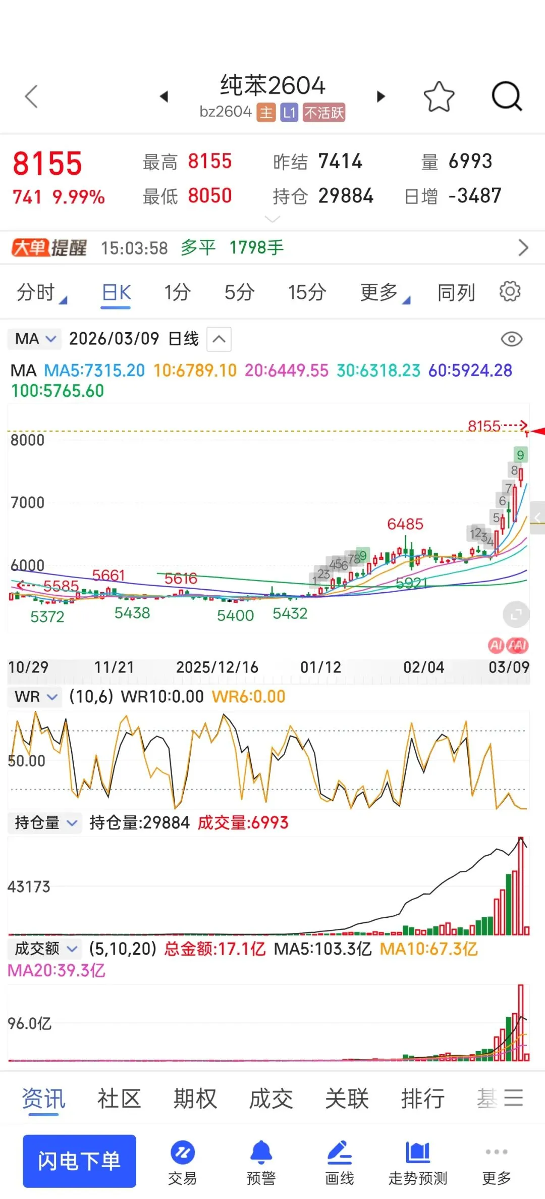 多个核心品种出现典型的“减仓涨停”特征,纯苯、苯乙烯等品种持仓量大幅下降,反映大量空头在巨额浮亏下被迫止损离场,空杀空行情进一步放大了涨幅。同时,全市场资金大幅流入能化板块,市场情绪进入狂热阶段,形成了“上涨-止损-再上涨”的正反馈,推动板块全线普涨。