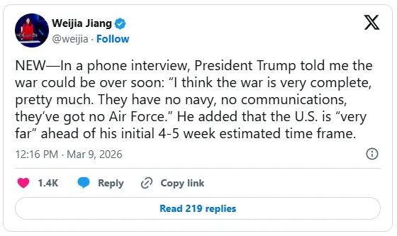 美国总统特朗普周一(3月9日)释放出有关伊朗战争可能接近尾声的最新信号,迅速提振市场情绪。CBS白宫高级记者Weijia Jiang披露,特朗普表示这场战争“基本上已经完成”,并称战事进展远快于自己此前预计的4至5周时间表。受此带动,美股三大指数自盘中低点明显反弹,原油价格也在经历暴涨后回吐部分涨幅。根据CBS白宫高级记者Weijia Jiang披露的信息,特朗普周一表示,对伊朗的战争“非常完整,差不多了”,并称伊朗“没有海军、没有通信能力,也没有空军”。他还表示,美国当前战事推进速度,远快于其最初估计的4至5周时间表。CBS此前报道也显示,特朗普在3月2日曾公开表示,政府原本预计这场战争将持续四到五周。