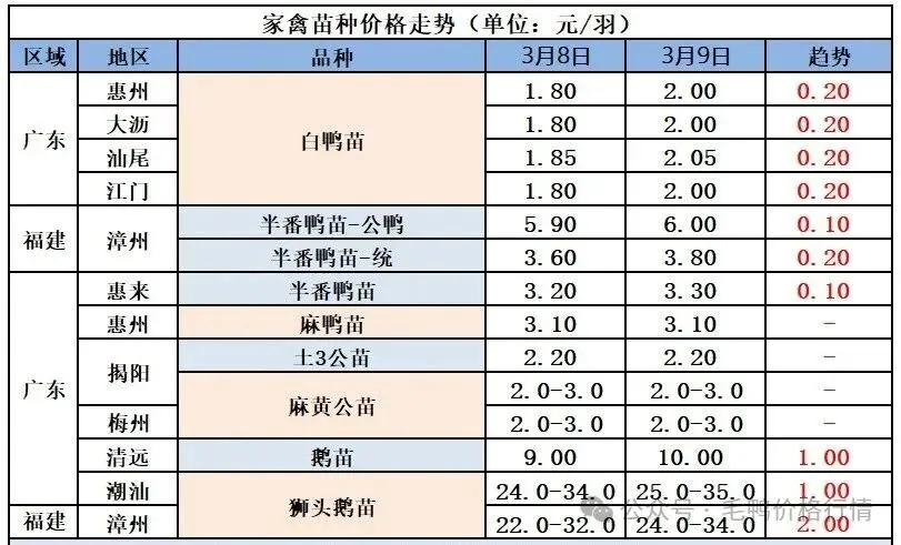 2026年3月10日鸭苗价格行情:(单位:元/羽)