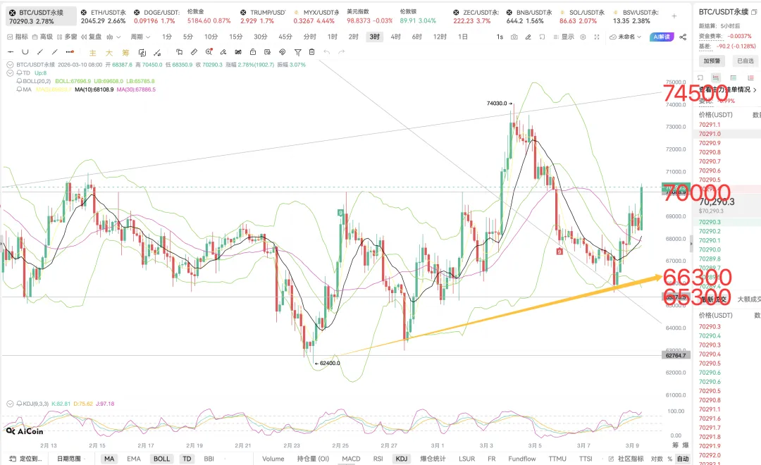 BTC今日行情分析,昨日所分析BTC上方压制位在70000整数关口,凌晨最高到达69500上方回落,跌幅在1200点。趋势图如图,目前BTC目前上破70000整数关口,可以关注前期高点71500附近压制,建议反弹71800-71500区间不破直接做空一次,破位上看72500附近再空;下方则关注66300附近支撑位,建议回踩66500-66800区间不破即可开仓做多,破位下看65500再多。