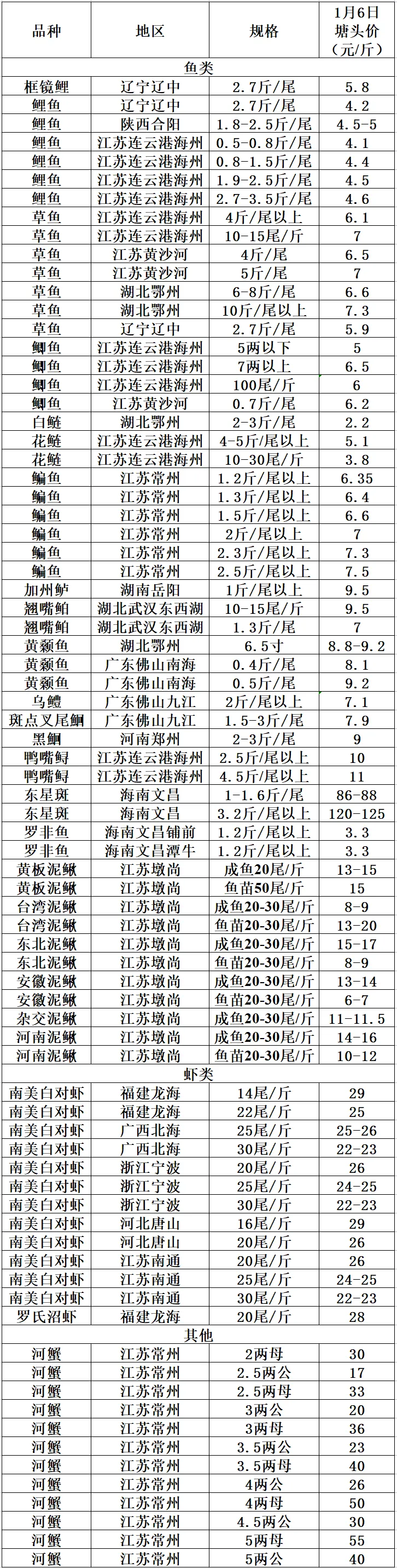 >2026年1月6日各地区水产品行情