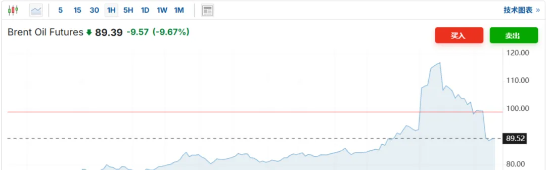 国际油价大幅回落,延续昨日尾盘暴跌走势,主因是美伊冲突缓和预期与 G7 考虑释放储备的双重压制。昨日油价上演 “过山车”,WTI 一度暴涨 31% 逼近 120 美元,川普暗示对伊战事基本结束,盘后重挫 11%,日内振幅超 40%。
