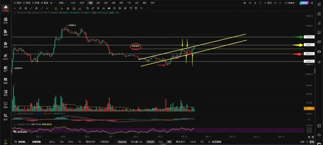 各位同学是不是很想做空?我也一样我也很想做空我劝你还是忍一忍,当下小时级别我并没有看见任何颓势信号,不要贸然入场接飞刀容易挨揍。因为大饼现在小时级别高低点一直在抬高,很明显小时级别是多头趋势并且很强势,看上方黄色箭头所指昨天两次假突破69248的阻力位都没有过去,同时向下回踩了两次68232的支撑全部获得支撑,既然跌不下去那就上涨呗!现在大饼已经成功突破69248的阻力位而且还突破了70069的位置,如果能稳住在70069之上运行下一个将要挑战的位置就是71675,只要回调不跌破70069-69248的区间支撑就不会去回踩下方的68232的支撑,70069-69248的区间支撑撑不住必须回踩68232的支撑,能撑住继续走反弹撑不住才会走回调,耐心等待大饼出现顶部信号在去做空,尽量不要左侧去猜做空,在上涨趋势面前没有顶部。