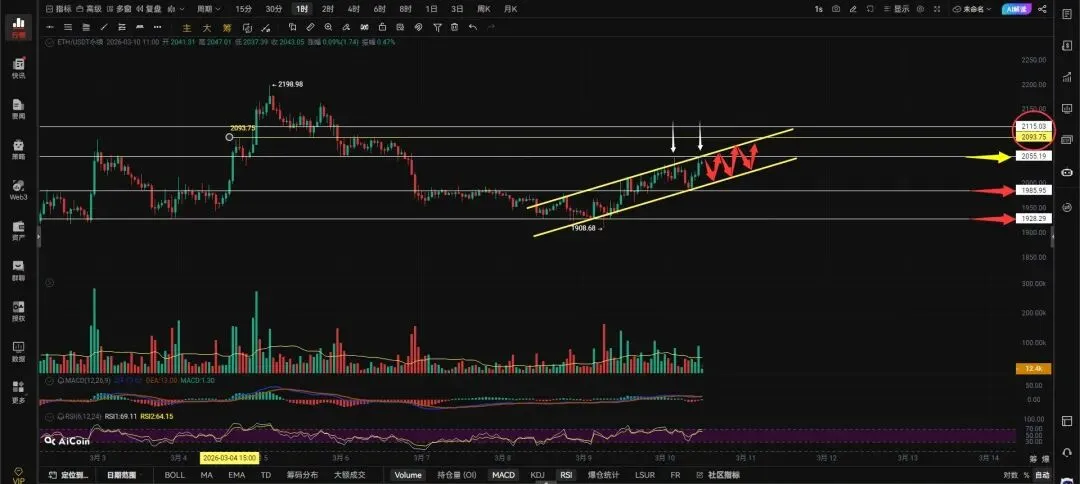 4小时级别跌破1998向下看1931-1905,二饼能突破看跌旗形对应的价格是2055才能去摸上方的2093-2115的位置,上方白色箭头所指的位置这里会不会走成双针探顶形态目前还未知,如果真的走双针探顶能保持在旗形内部走震荡啥事没有,跌破旗形1985的支撑会被顺破,跌破1985回调就开始了,散会。