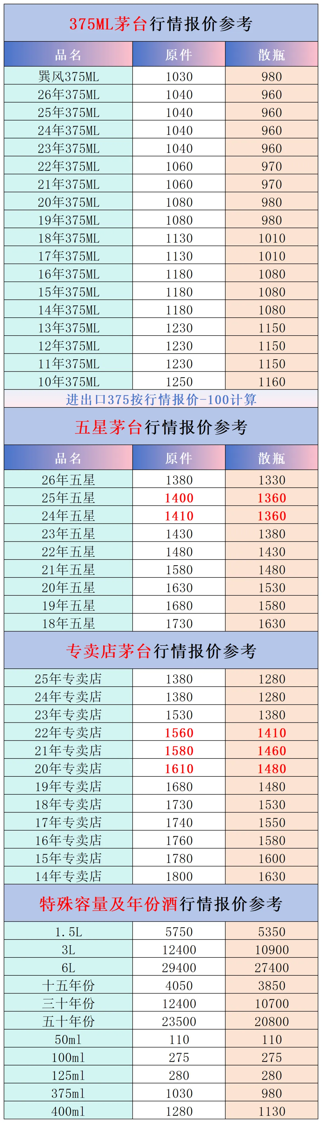 本公众号提供各种名酒回收行情报价,常规茅台、五粮液、洋河、剑南春、国缘等。所有报价根据市场买卖行情总结而来,每天更新最新报价!部分酒水每天涨跌幅较大,无法及时更新请谅解。本报价仅供参考,并非实际成交价格。感谢您的关注!我们会竭尽所能,提供更多更好的服务。