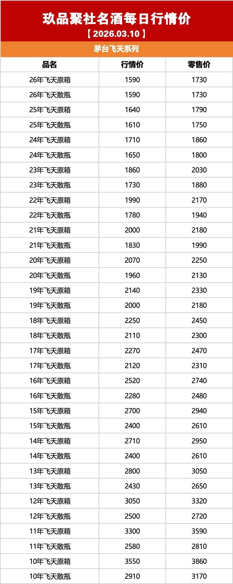 玖品聚社名酒行情:2026年03月10日茅台行情价