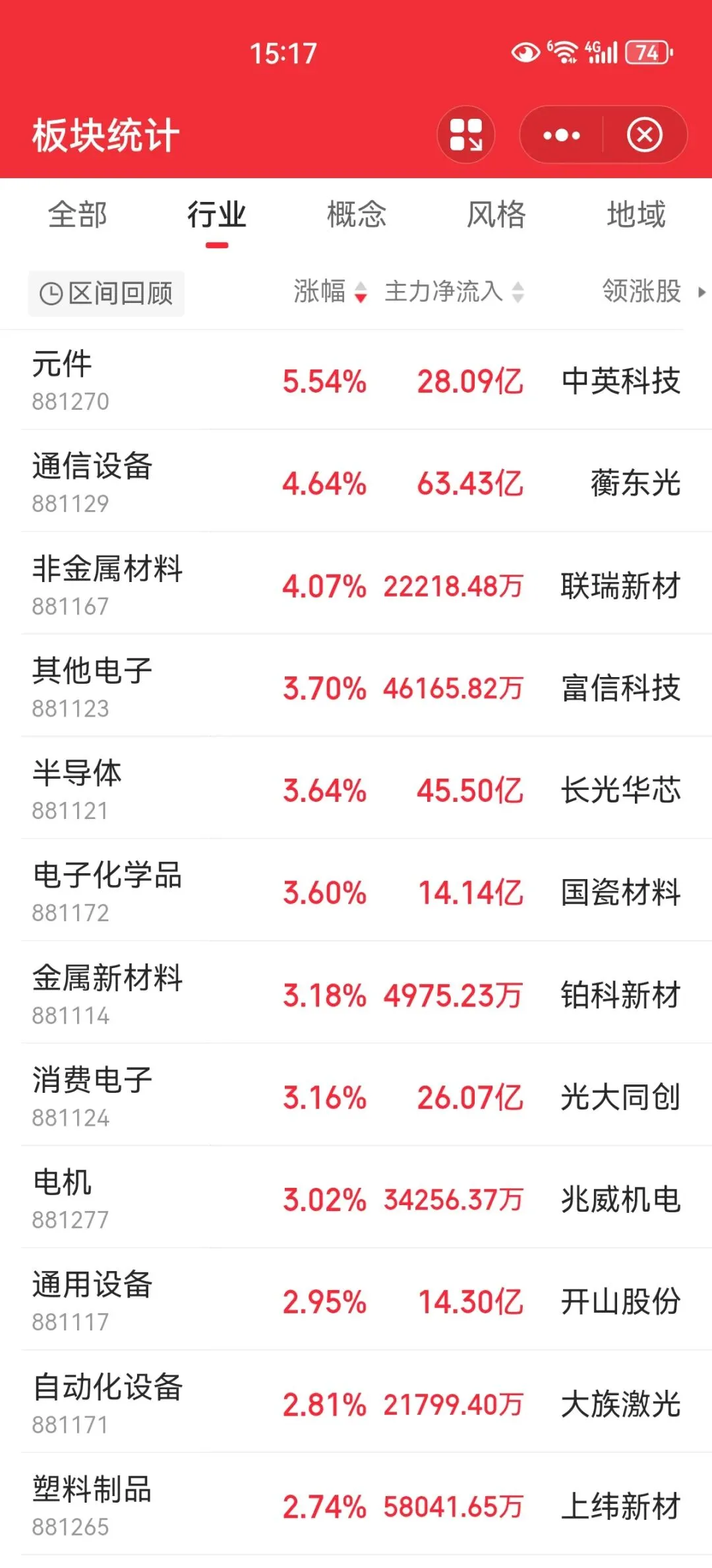 行业板块多数收涨,电子元件、通信设备、非金属材料、半导体、电子化学品、消费电子、通用设备板块涨幅居前,石油石化、煤炭、化学原料板块逆市走弱。