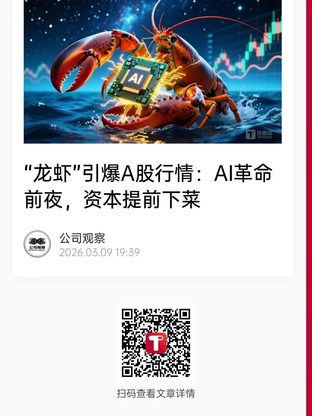 这场“龙虾行情”,需要看盘面——谁在真正在“养虾”、资金如何布局;也要看技术与产业——这套路线是否足够成熟、是否不可替代;也要回到最朴素的一点:在安全边界和商业模式仍然模糊的当下,这只“龙虾”究竟能为现实世界创造多少可持续的价值。