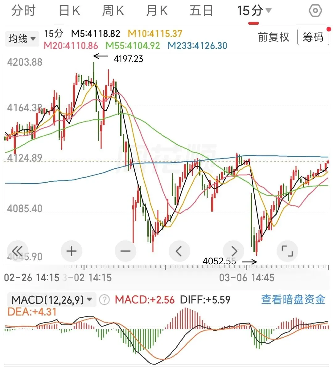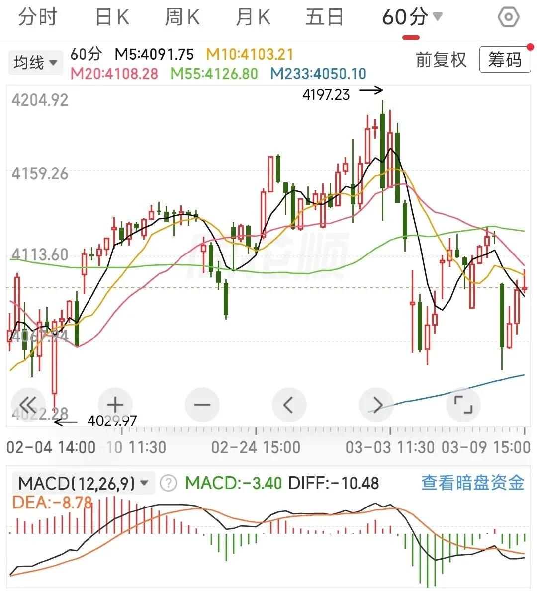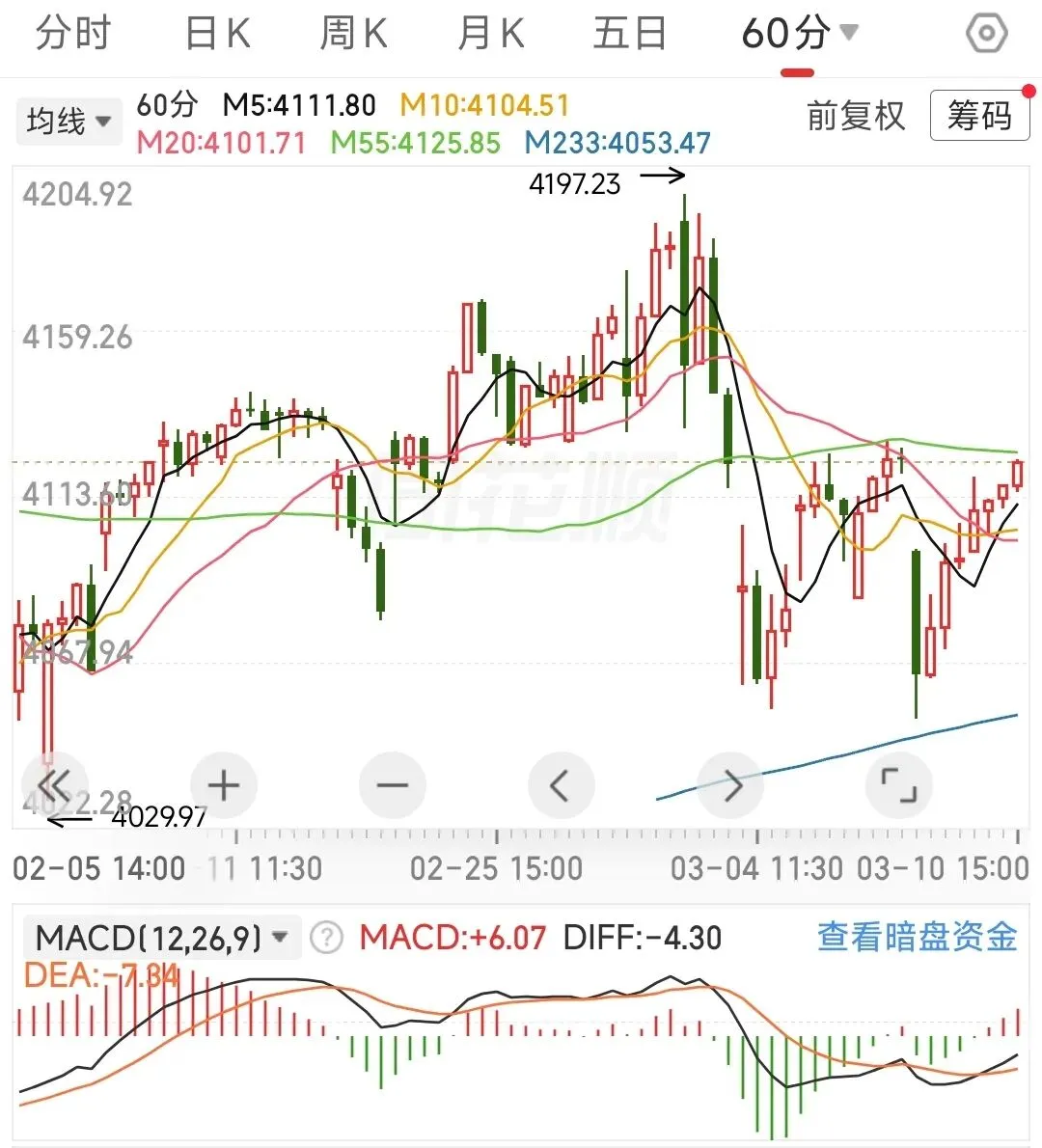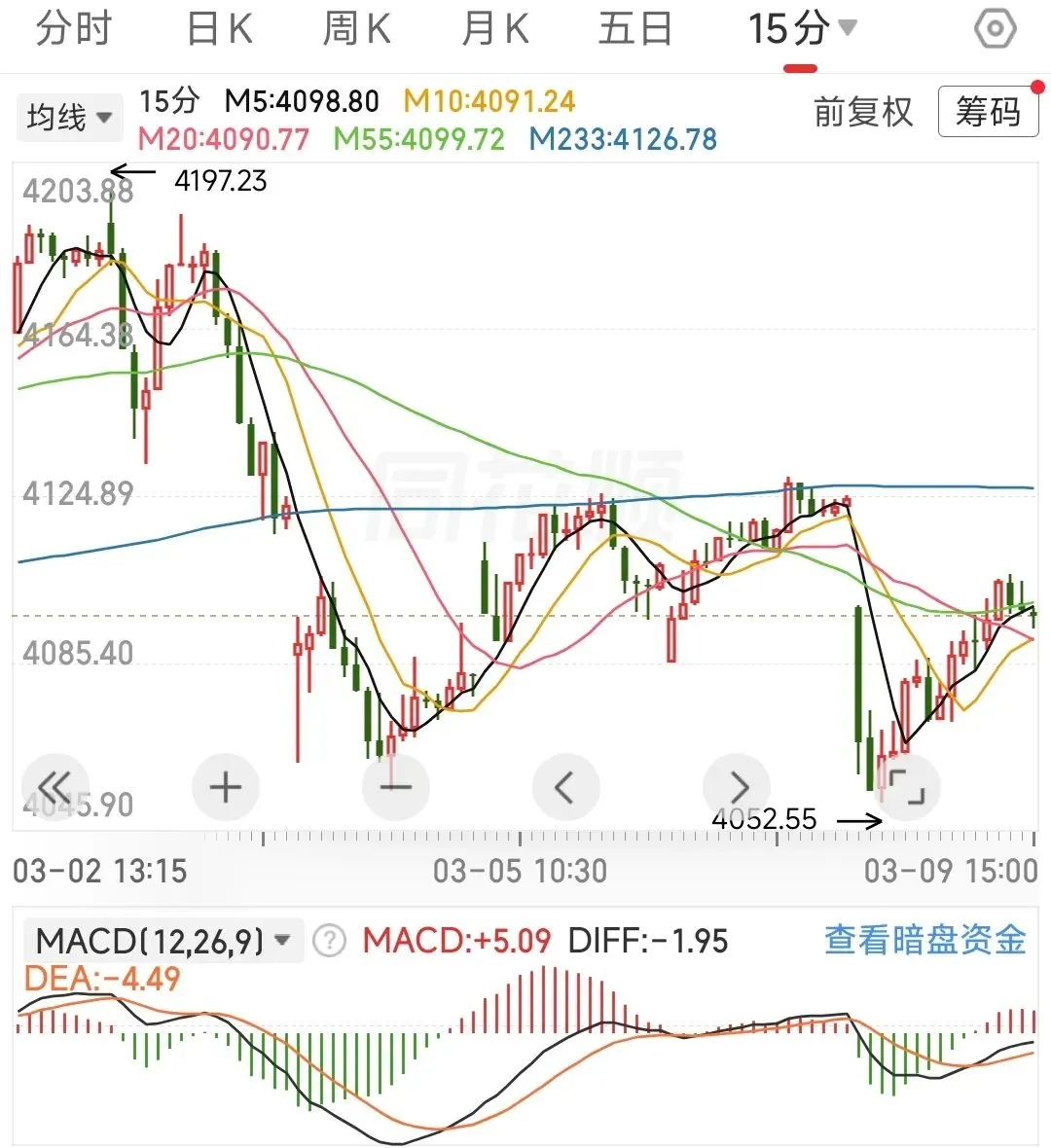 60分钟应对策略:macd金叉,确认60分钟出现底背离,继续按中枢振荡假设交易,回踩233线买入,反弹不破55线T出。若后续外围冲突恶化,行情可能会演变为由4197.23点开启的新一轮单中枢下跌,既存在再次回调233线的风险。15分钟应对策略:行情变化有点快,今天未加仓的建议再观察一下,15分钟未必能一举突破233线,在更小的级别上应该是出现顶背离啦,如果后续15分钟能围绕55线振荡一下,向上突破的概率会增大。已加仓的,若跌破55线,建议先减仓保本。建议的应对策略:外部风险不在咱们的把控范围内,内部的话重要会议期间,我觉得指数大跌的风险不大,但板块间的分化有点极致。跌幅太大的票,在做好仓位管理的前提下,以做正T为主,先不要搞成加仓,忌追高。分析沪指是为了辅助个股的操作,好比说沪指信号是买入,个股出现买入信号的可信度更高,卖出同理。