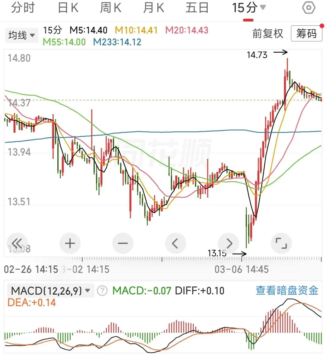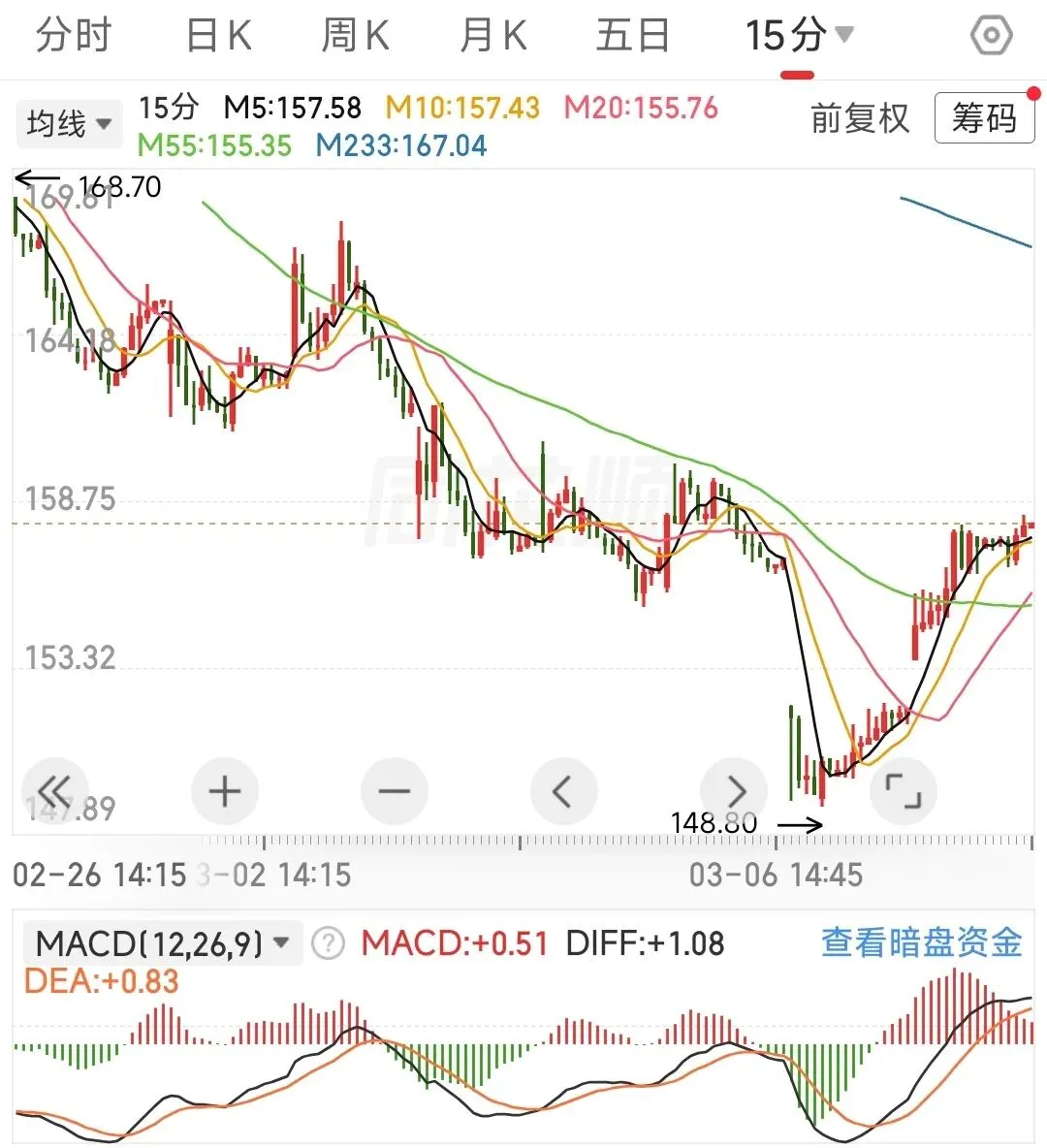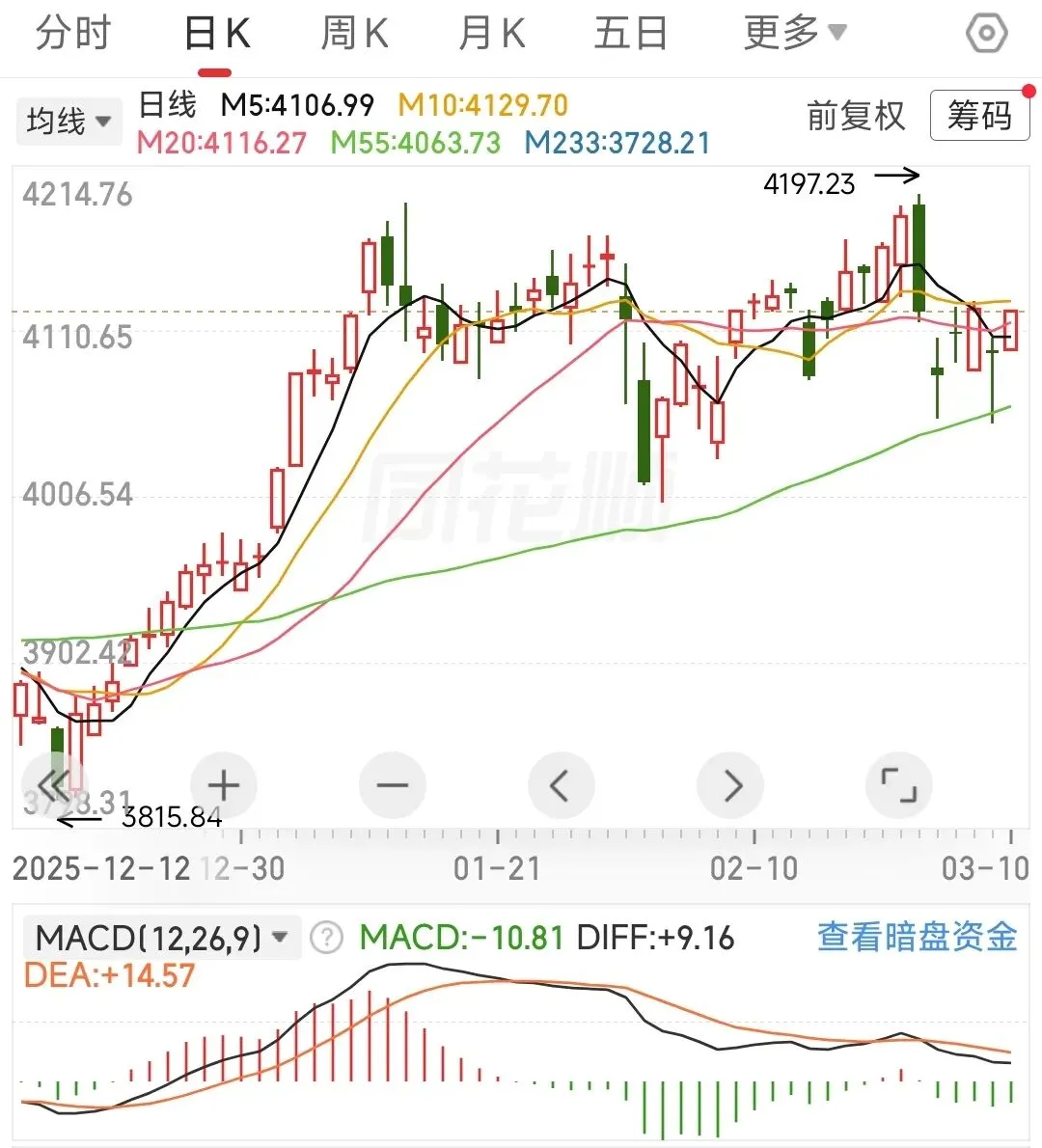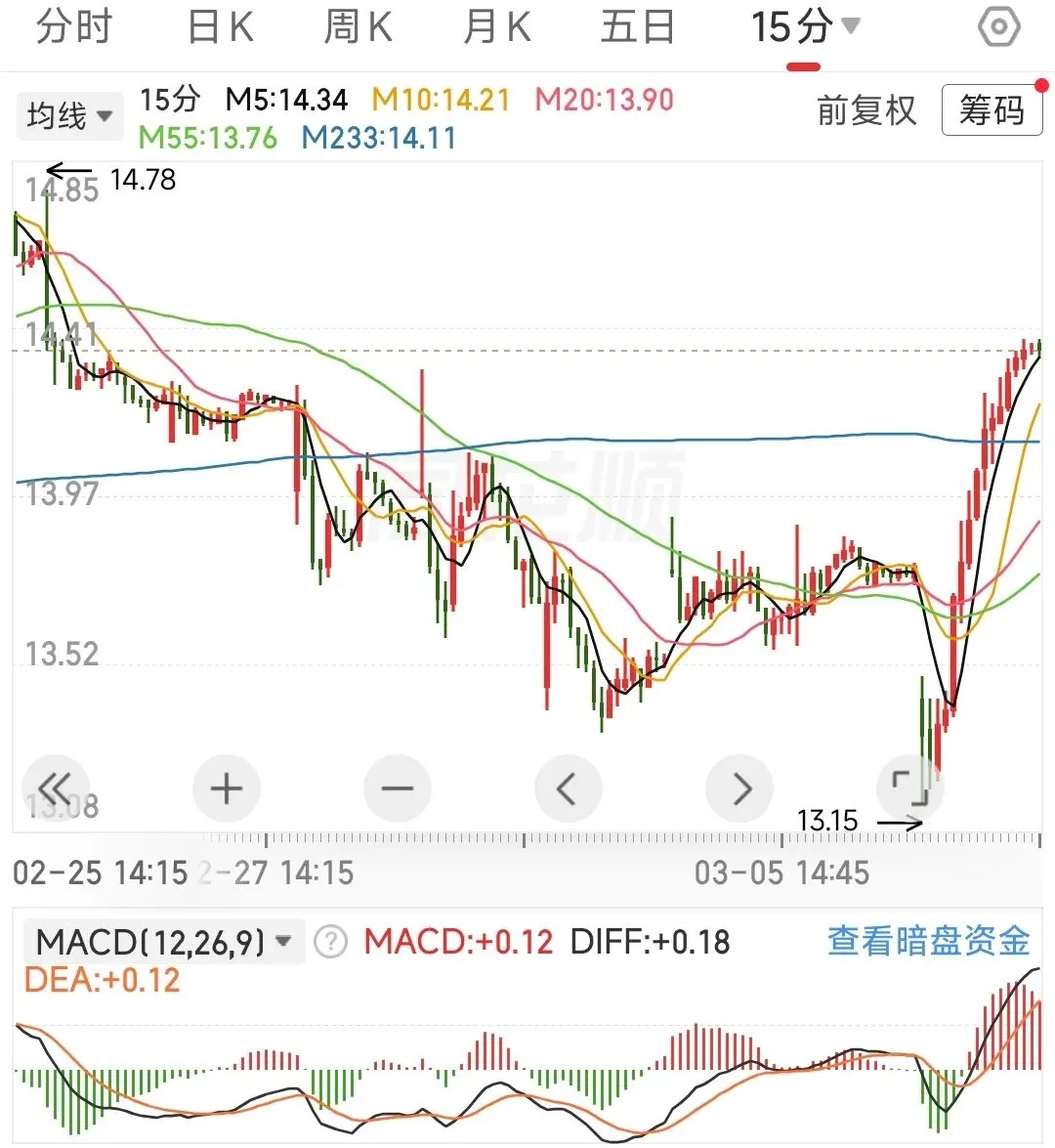 60分钟应对策略:macd金叉,确认60分钟出现底背离,继续按中枢振荡假设交易,回踩233线买入,反弹不破55线T出。若后续外围冲突恶化,行情可能会演变为由4197.23点开启的新一轮单中枢下跌,既存在再次回调233线的风险。15分钟应对策略:行情变化有点快,今天未加仓的建议再观察一下,15分钟未必能一举突破233线,在更小的级别上应该是出现顶背离啦,如果后续15分钟能围绕55线振荡一下,向上突破的概率会增大。已加仓的,若跌破55线,建议先减仓保本。建议的应对策略:外部风险不在咱们的把控范围内,内部的话重要会议期间,我觉得指数大跌的风险不大,但板块间的分化有点极致。跌幅太大的票,在做好仓位管理的前提下,以做正T为主,先不要搞成加仓,忌追高。分析沪指是为了辅助个股的操作,好比说沪指信号是买入,个股出现买入信号的可信度更高,卖出同理。