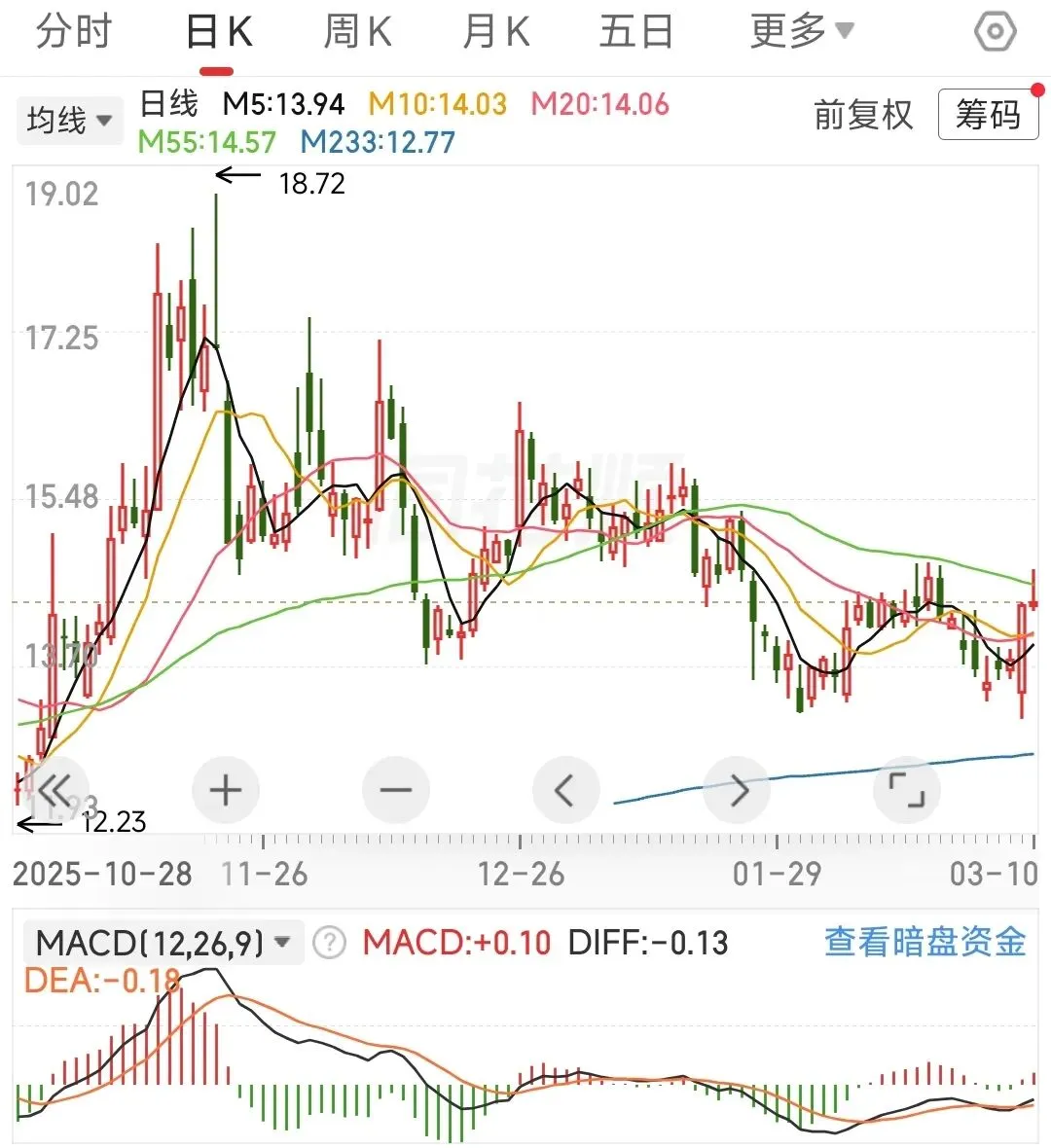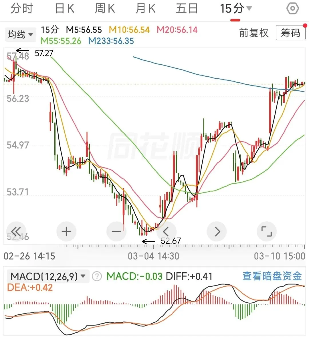 星源材质:日线受55线压制,触线之后出现回调,15分钟是否回调到位当前不确定(看5分钟K线有结束的迹象),只要不破233线,加仓干。长期看,等固态电池发酵,会有大行情的。大周期判断不变,周线按单中枢上涨假设来操作,压力位为周233线,若突破后回调站稳则加仓。