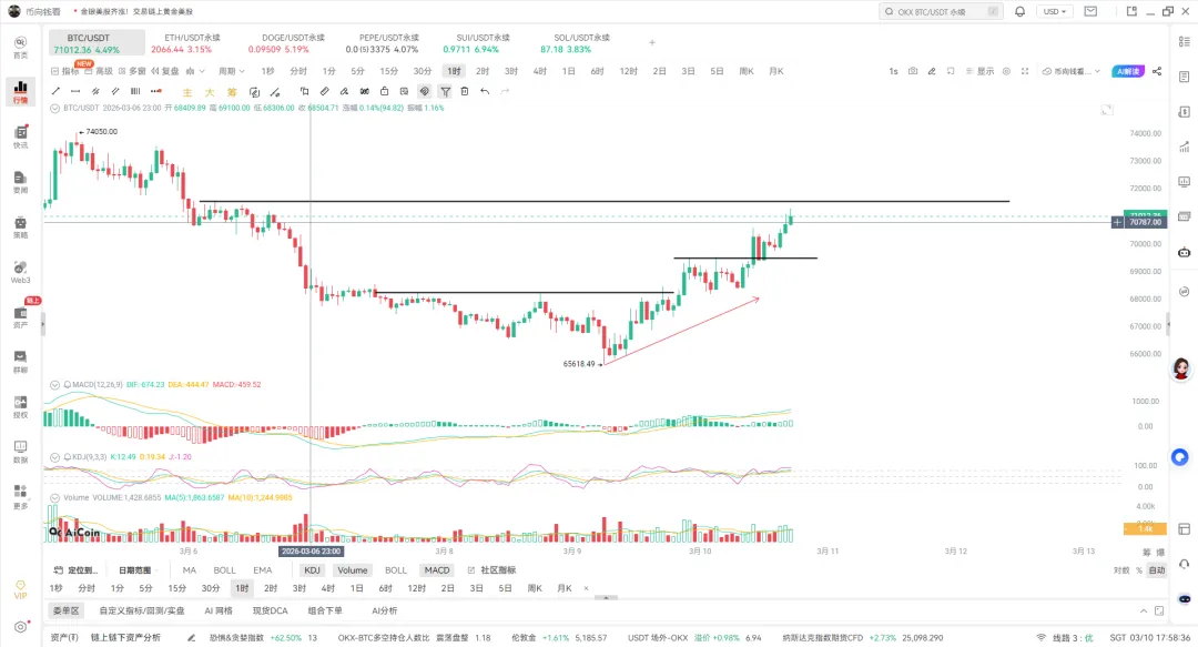 - 现价与区间:当前价格 71,012.36 USDT,涨幅超 4.49%,强势突破前期震荡平台。