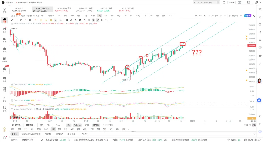 - 价格区间:当前价格 2065.84 USDT,涨幅 3.56%,近期低点 1906.63 USDT,上方触及 2142.38 USDT 历史次高区域。