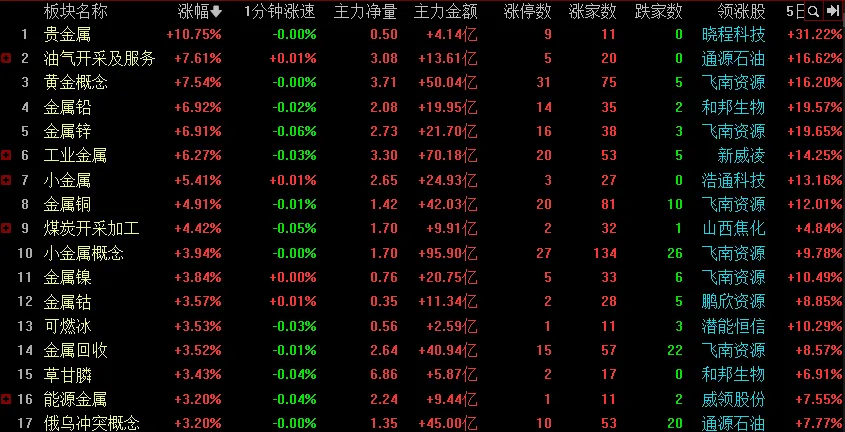 答案就在涨幅榜上:清一色的资源股、有色板块,工业金属等等全线异动。