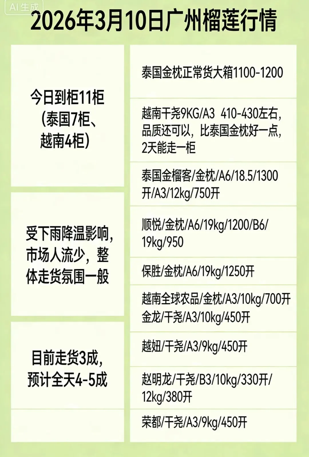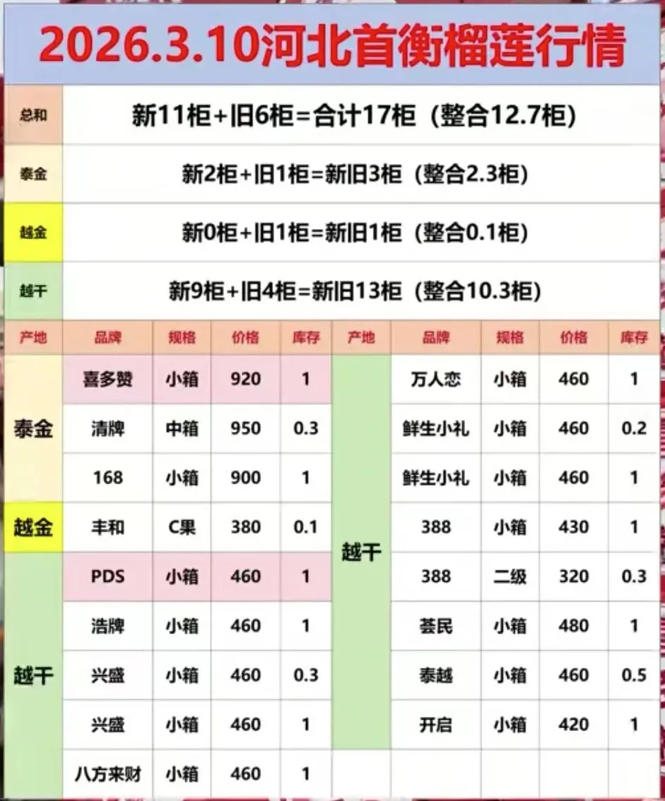 3月10号高碑店、广州榴莲行情及产地榴莲报价.