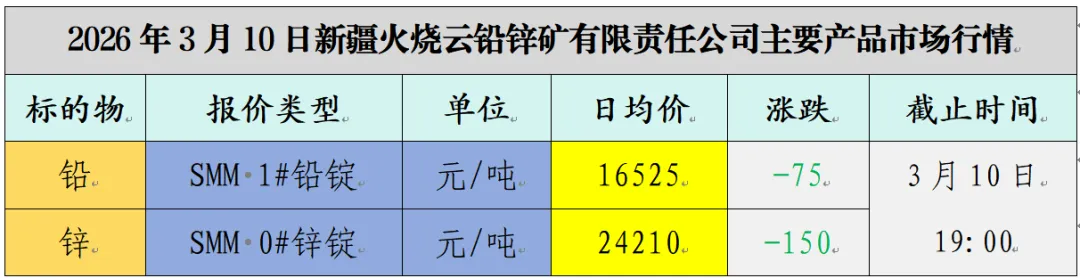 >今日行情 | 2026年3月10日新疆火烧云铅锌矿有限责任公司主要产品市场