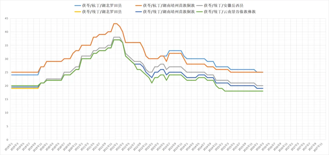 茯苓产地货源充裕,近阶段有市场商家及厂家采购,货源进入实际消化阶段,整体走销情况良好,行情略有上浮,因质量不等,现方片价格在26-29元;中心丁色选货28元,云南产25元;小米丁20-22元,一刀丁19-21元,边丁12-15元。