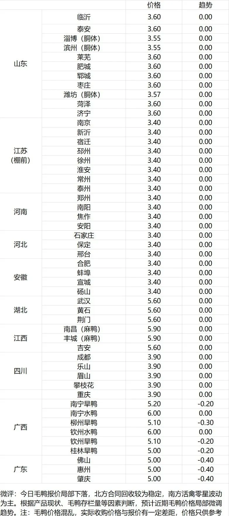 微评:鸭苗报价上涨。(注:南方只报当天价格)养殖成本高企,市场情绪一般,交投平淡。根据产品、养殖成本及鸭苗现状分析,预计近期鸭苗价格呈震荡微调趋势。种蛋报价涨5分。温馨提示:该价格为主流厂家报价,实际销售价格以成交价格为准,价格仅供参考。