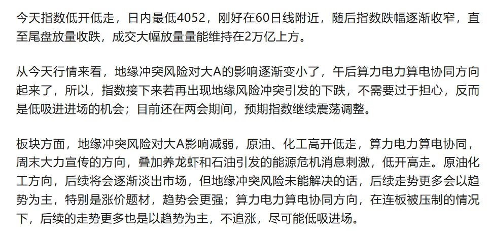 市场永远是对的,错误的是你的预期和策略,不要与市场争辩,而要与自己和解!!!今天指数小幅高开高走,全天中小票强势,权重偏弱,尾盘缩量收跌,成交缩量,量能维持在2万亿上方。指数目前继续看震荡调整,后续指数若再次出现大幅调整的情况,依然是机会大于风险。同时,两会也将结束,市场风格将会进行切换,市场将由叙事题材炒作转向业绩和基本面(年报、一季报披露),所以,现在需要小心一些概念性题材的炒作(特别是高位的),重点关注业绩和基本面良好甚至超预期的方向或个股。板块方面,资金今天又轮动到了AI硬件,算电协同方向则有所调整。AI硬件,还是以趋势为主,不追涨进场,重点关注业绩超预期的核心个股;算电协同方向,在连板压制情况下,后续也是以趋势为主,不追涨进场,重点关注核心个股,特别是业绩超预期的个股。化工,近期受地缘冲突风险影响,波动比较大,目前地缘冲突风险影响减弱了导致有所调整,但其本身的供给端、需求端和价格周期等长期逻辑并未改变,继续看好其趋势向上。一、定增与资本运作:珠海冠宇、龙磁科技启动再融资