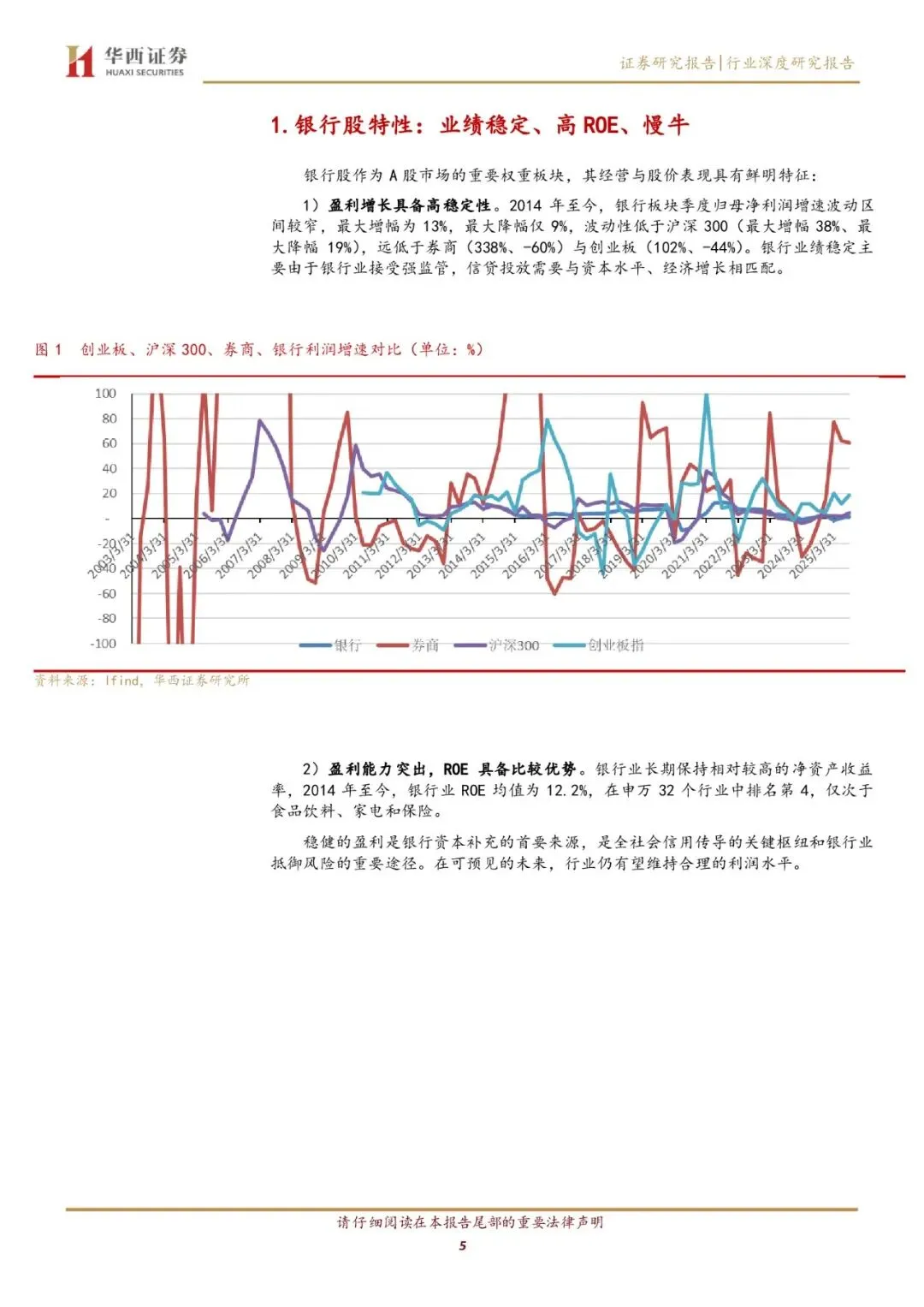 银行股作为A股市场的重要权重板块,具有高ROE、高稳定性、慢牛等显著特征。其盈利波动性远低于沪深300、券商及创业板,且具备防御性和绝对收益潜力。银行股的长期走势以慢牛为主导,且在多数时期表现稳健,尤其在经济复苏背景下,其估值修复逻辑清晰。